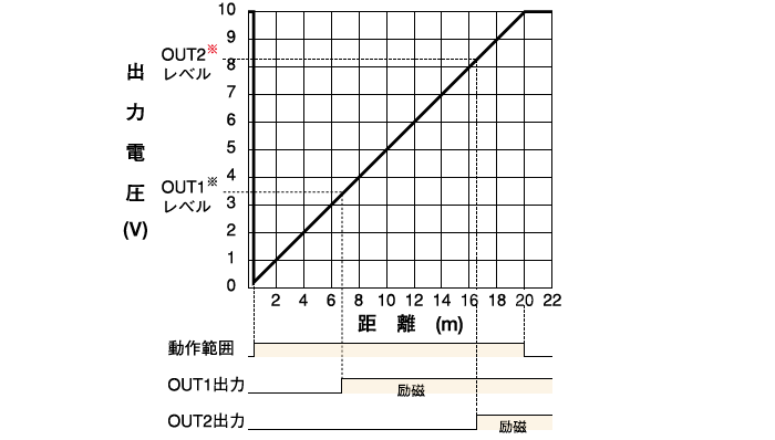 距離データをアナログ値(0~10V)で出力し(Rモード)、受光量をアナログ値で出力します(Tモード)。