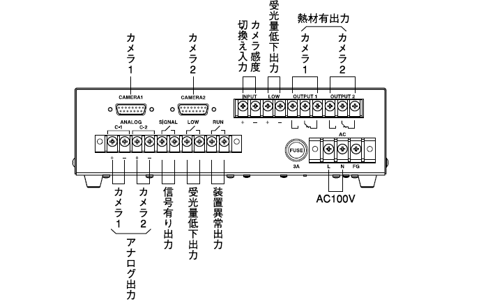 | 受光量低下出力(LOW) | フォトカプラ出力 Vce≦DC80V、lc≦DC50mA 1点(各カメラのOR) | |